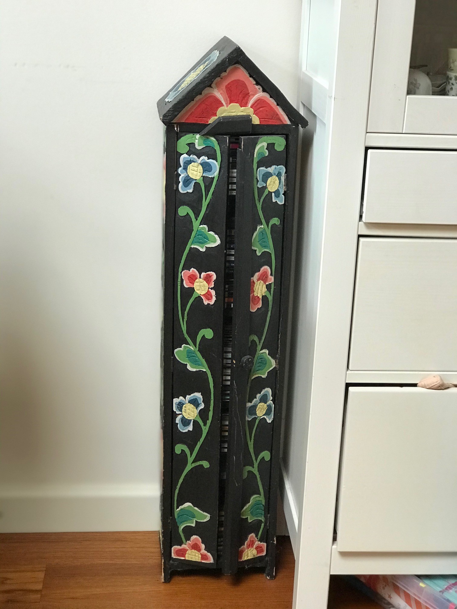 ‘Ik vertegenwoordig in jouw huis je Indische achtergrond’,  zegt het gekleurde kastje. Grappig zeg, zo voelde dat toen ook. ‘Vaak ben je trots op je heritage en soms vind je het moeilijk, maar ik ben er gewoon altijd,’ vervolgde ze. Er viel een stilte.
